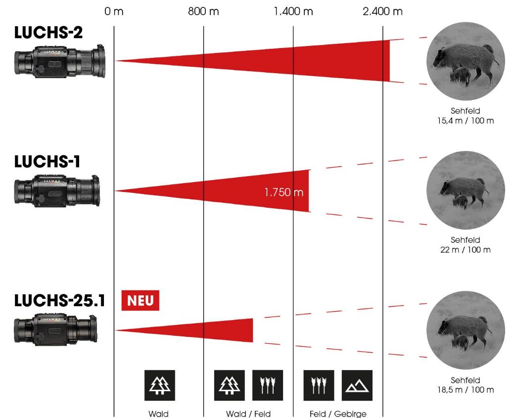 Für die LIEMKE Vorsatzoptiken haben wir uns genau diese Eigenschaften zunutze gemacht. Erleben Sie die Dunkelheit durch die Augen des nachtaktiven Jägers und behalten Sie die Nacht sicher im Blick – mit der LIEMKE LUCHS-Familie. Die einzigartige Kombination aus großem Sehfeld und hoher Reichweite mit unübertroffener Bildqualität macht die LIEMKE LUCHS-Familie zu Wärmebild-Vorsatzgeräten im Premium-Segment, die ihresgleichen suchen. Dank ihrer kompakten Bauweise, langen Akkulaufzeit und der intuitiven Bedienung setzen die LUCHS-Vorsatzoptiken neue Qualitätsmaßstäbe in der praktischen Anwendung.